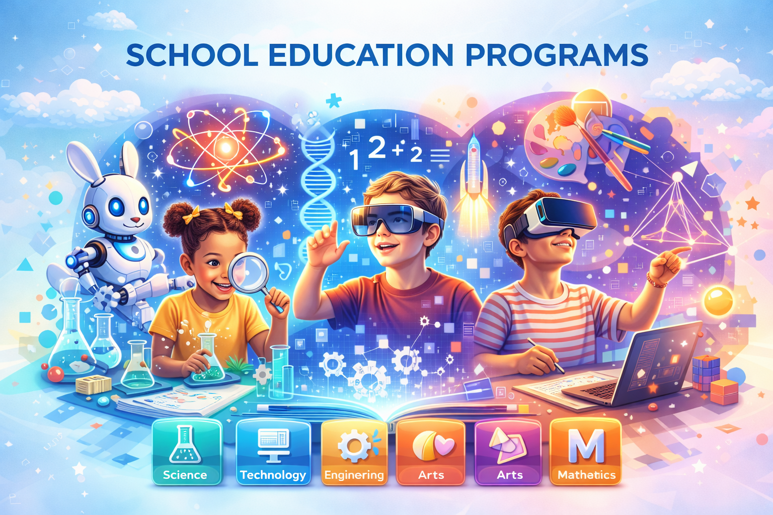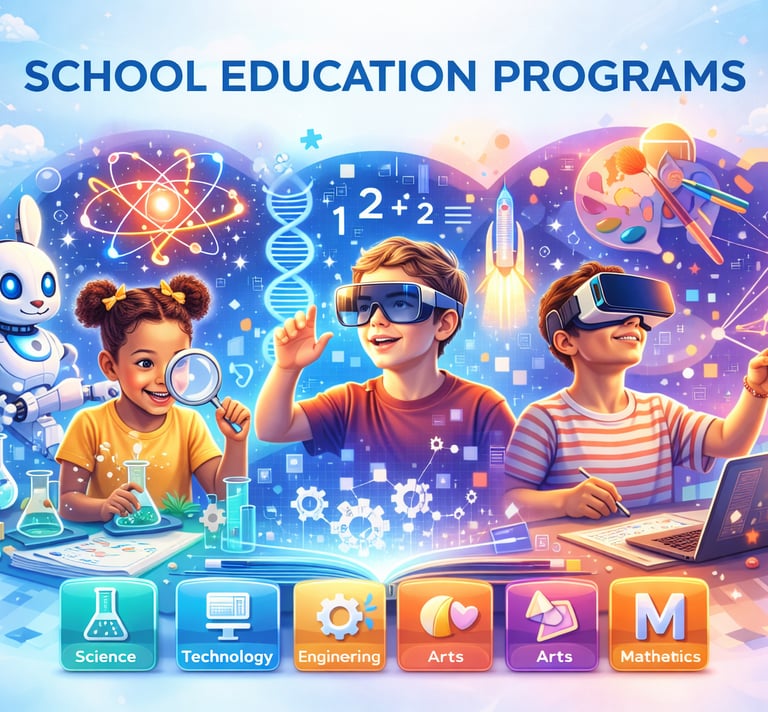 Technocreation delivers integrated STEM programs combining Robotics, AR/VR, Science, and Mathematics for holistic learning.